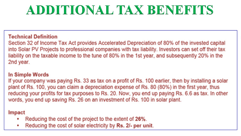 It generates power and helps in removing the day time dependency on grid, diesel or any other convectional source of energy, also reduces monthly electricity bills.
